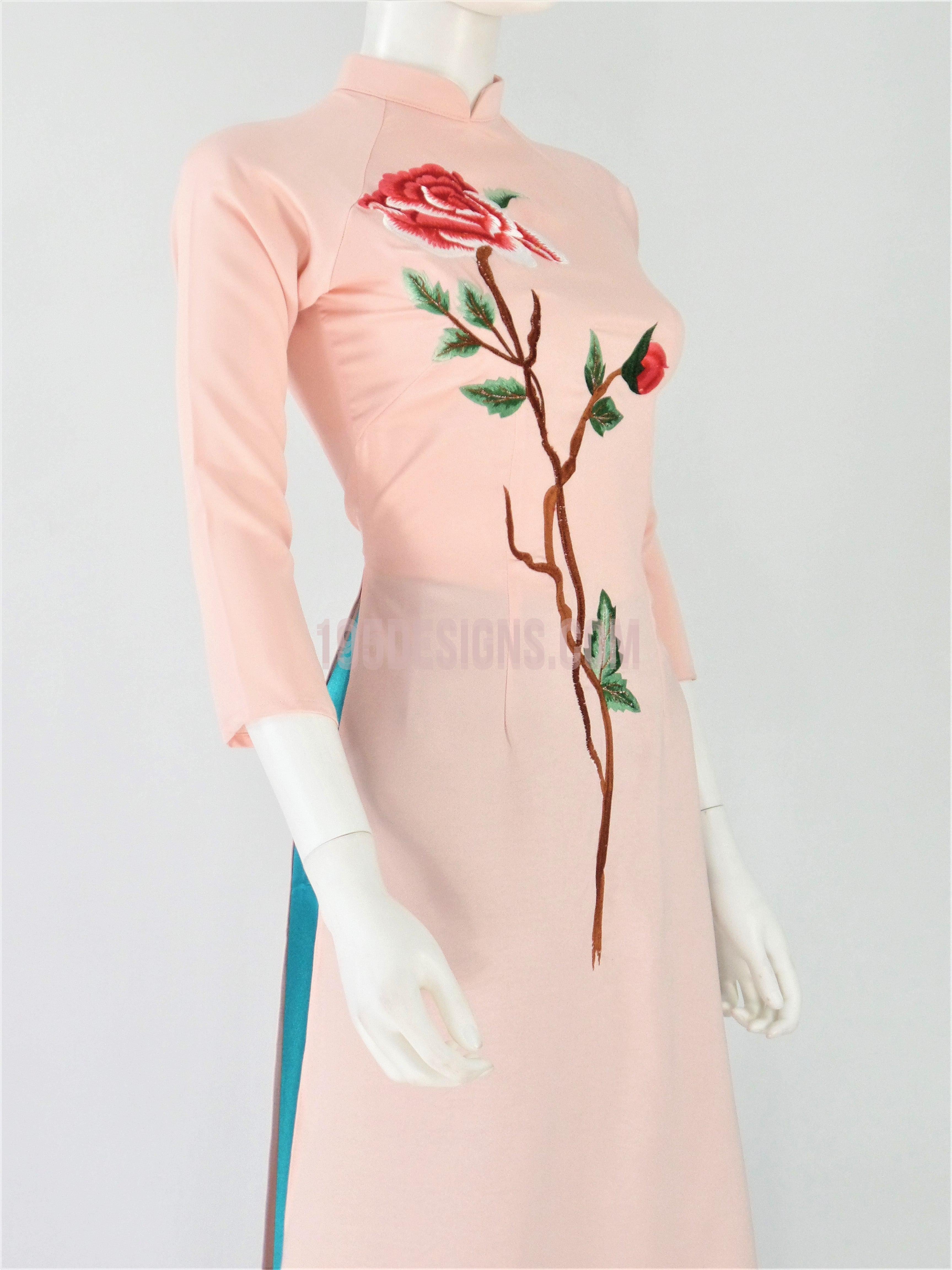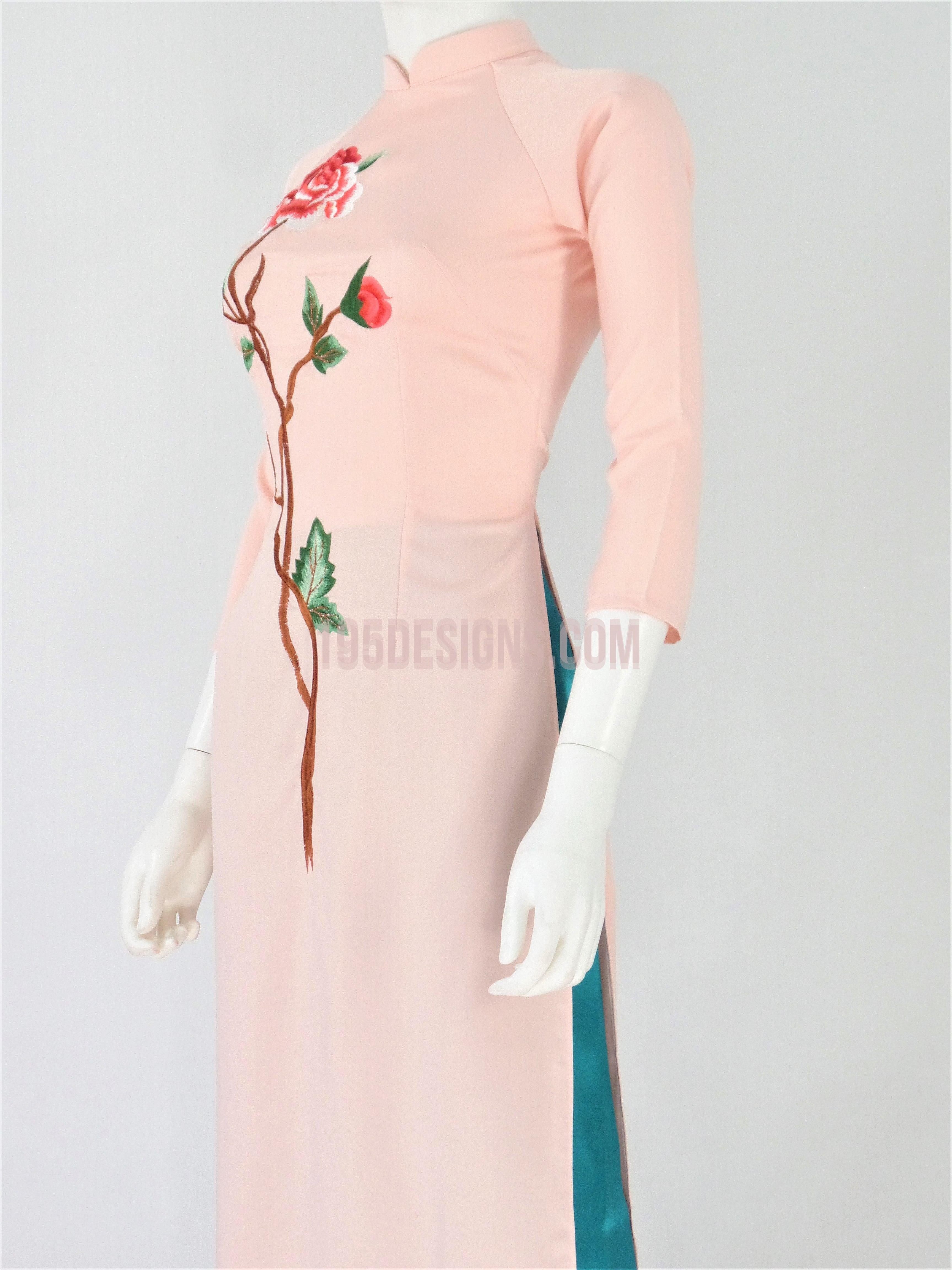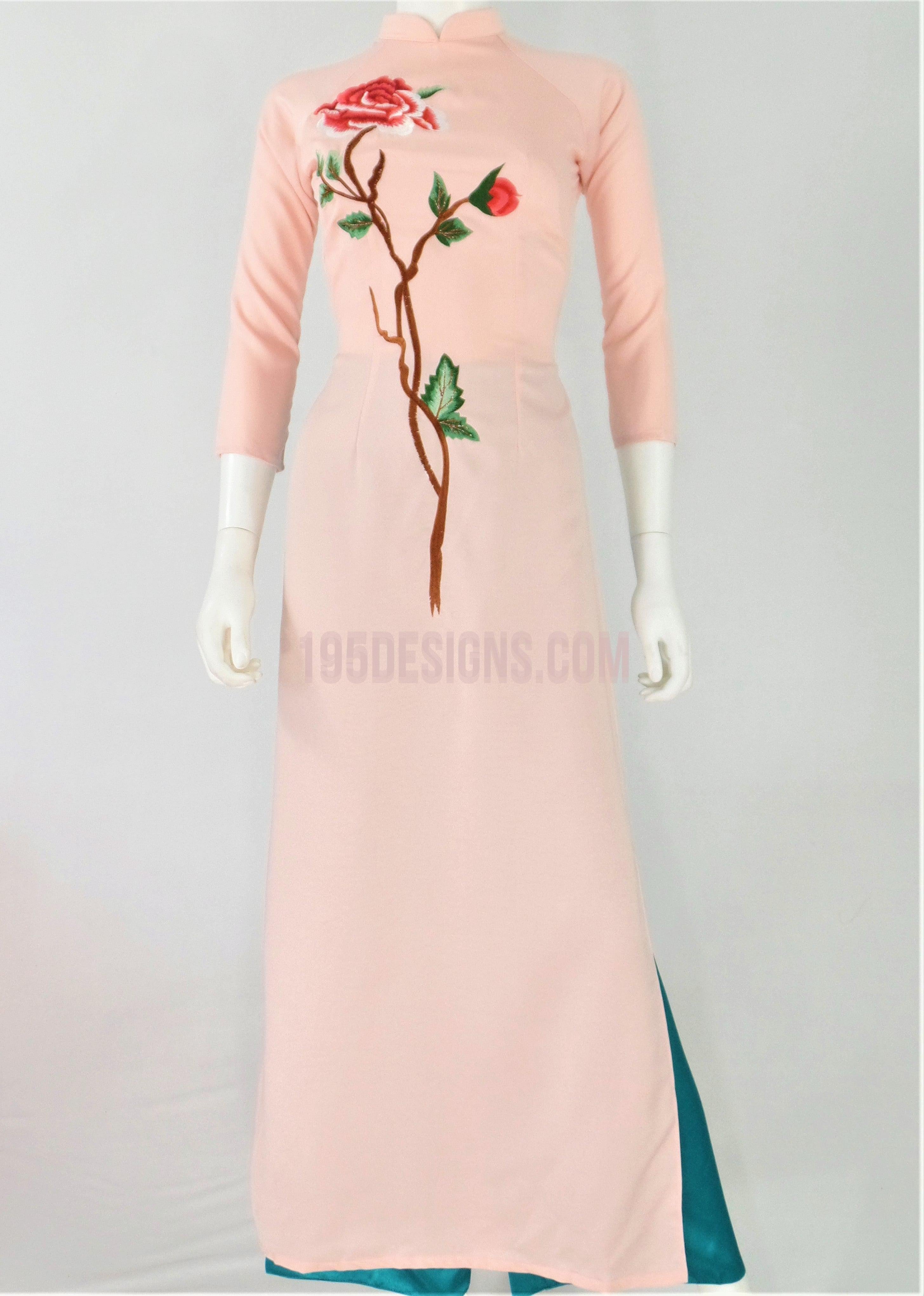 Áo Dài Lụa Hồng Thêu Hoa | Pink Ao Dai Flower Embroidery