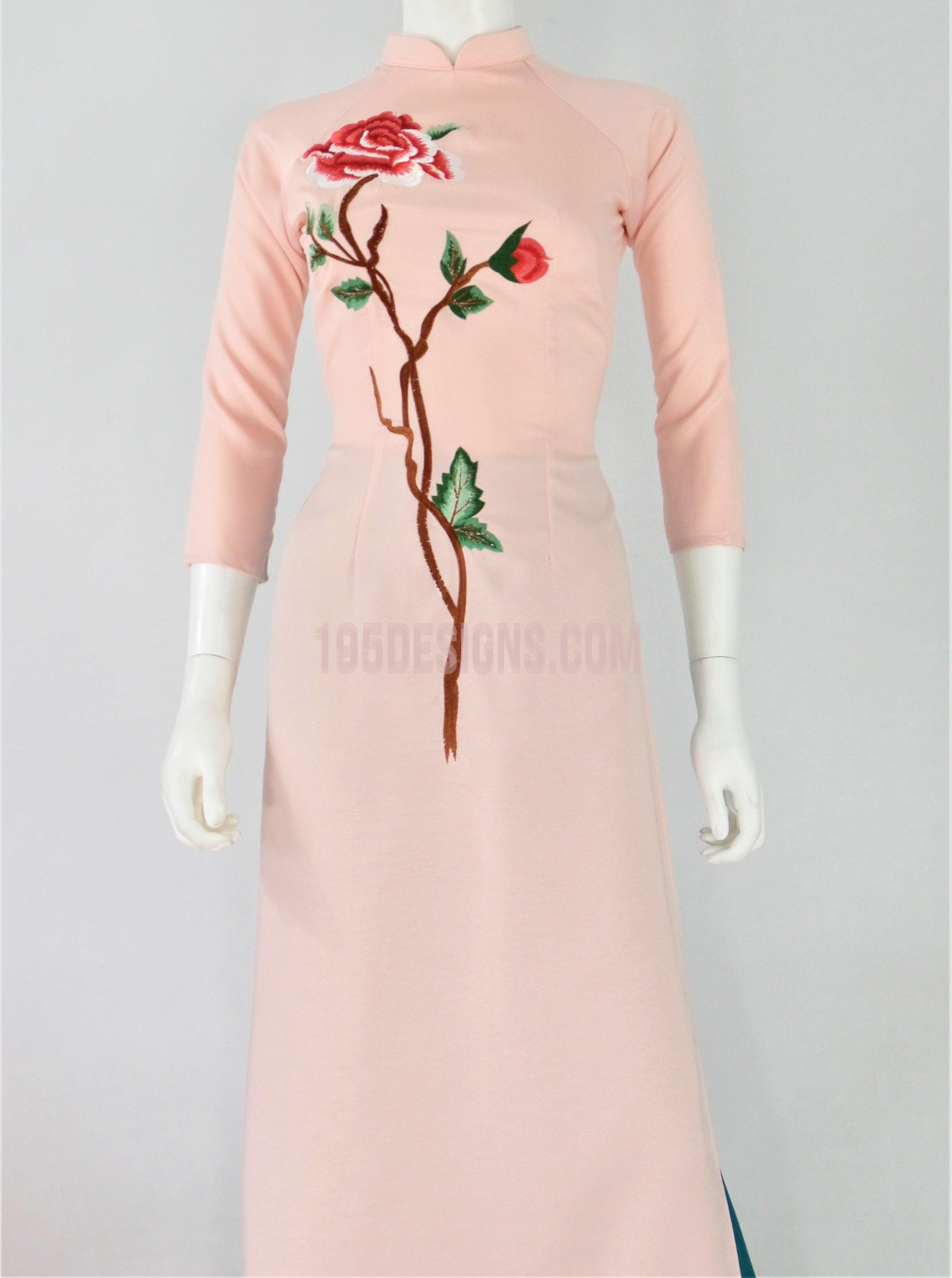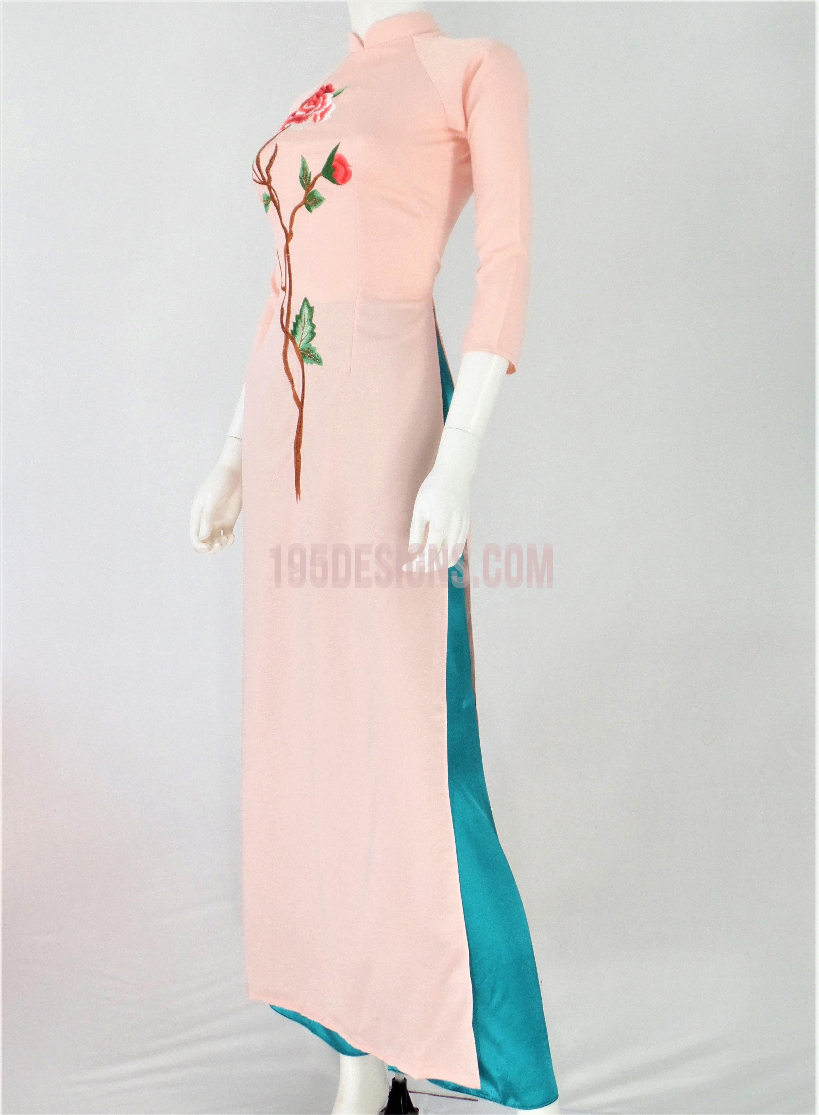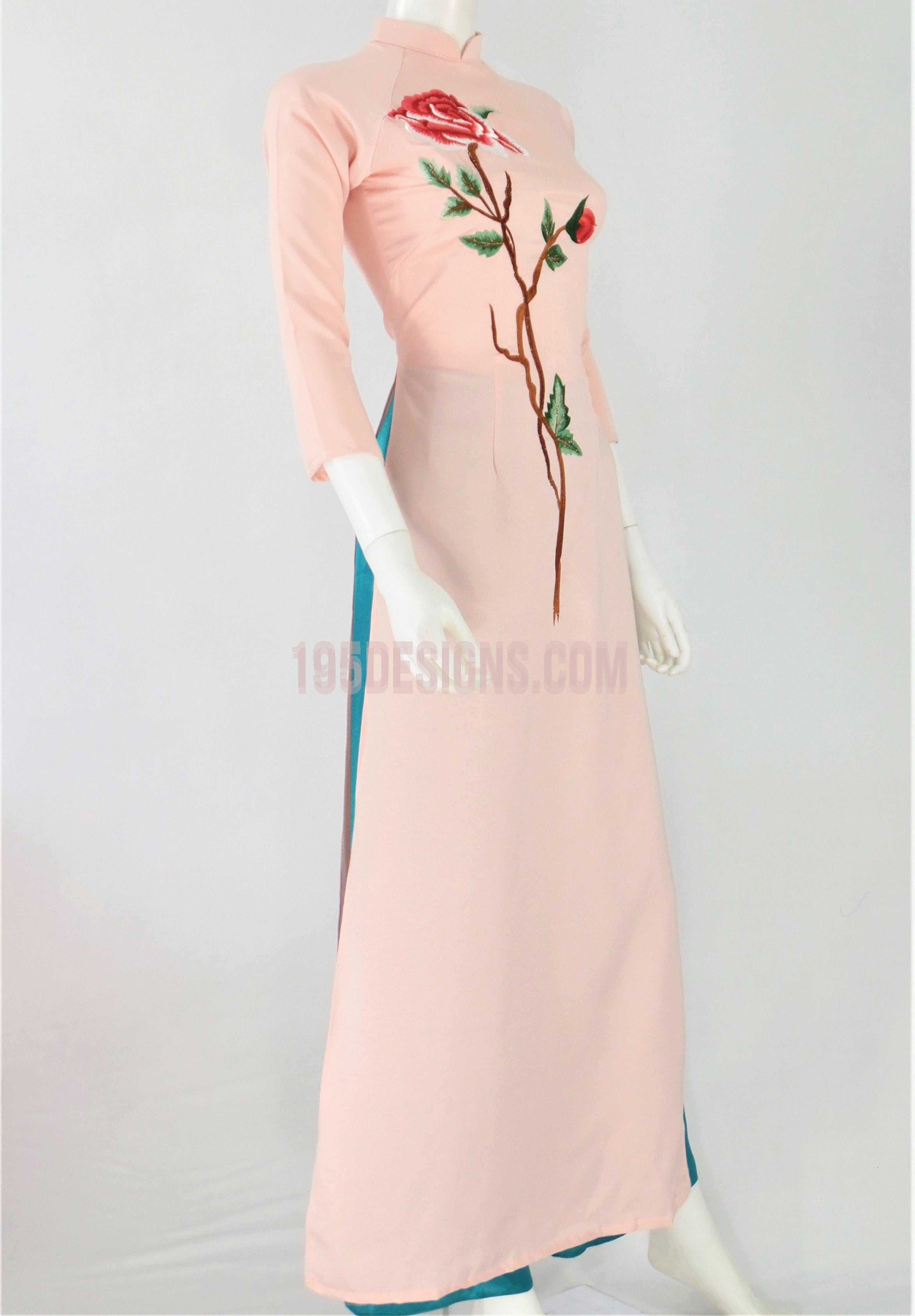 Áo Dài Lụa Hồng Thêu Hoa | Pink Ao Dai Flower Embroidery