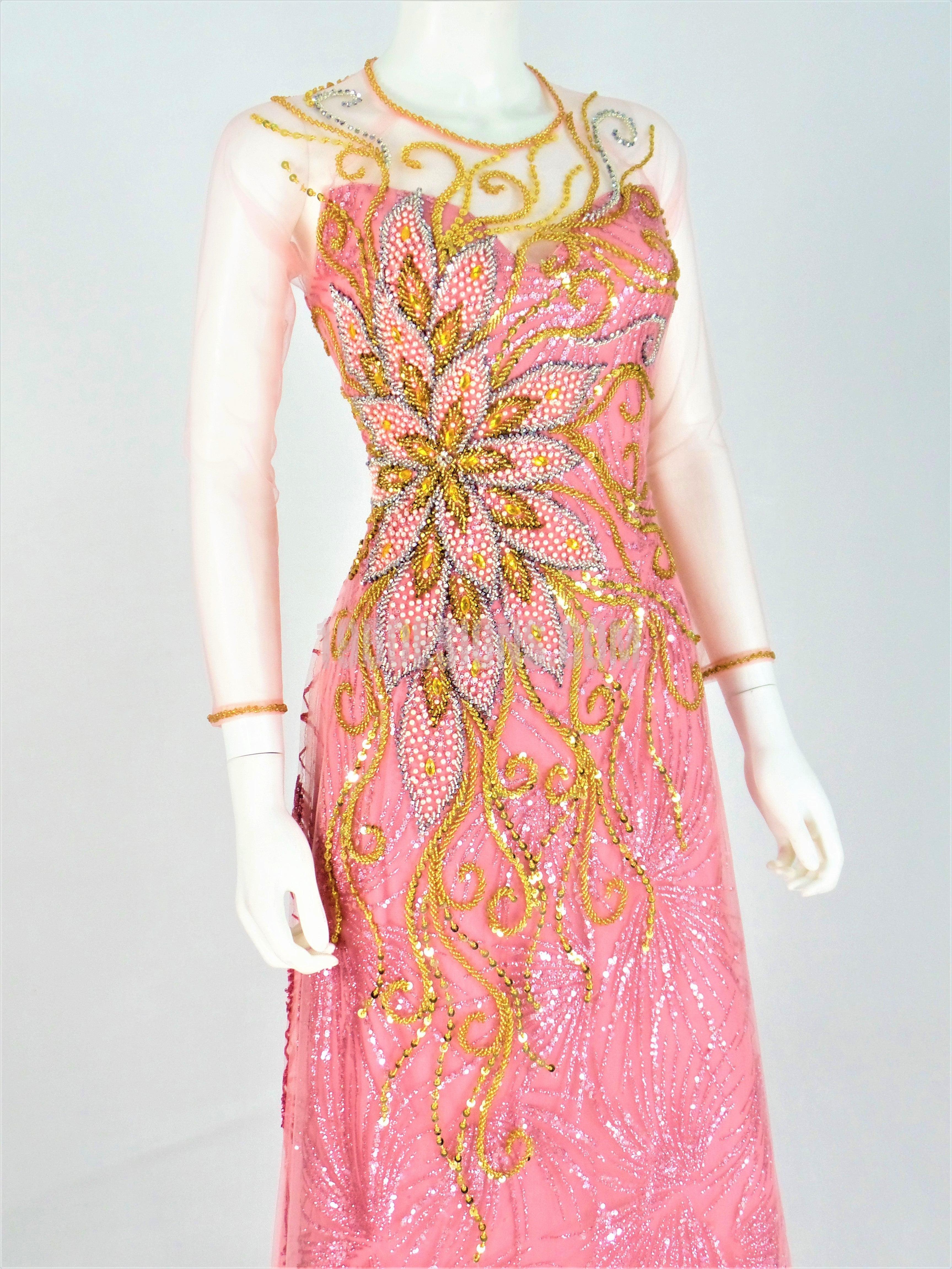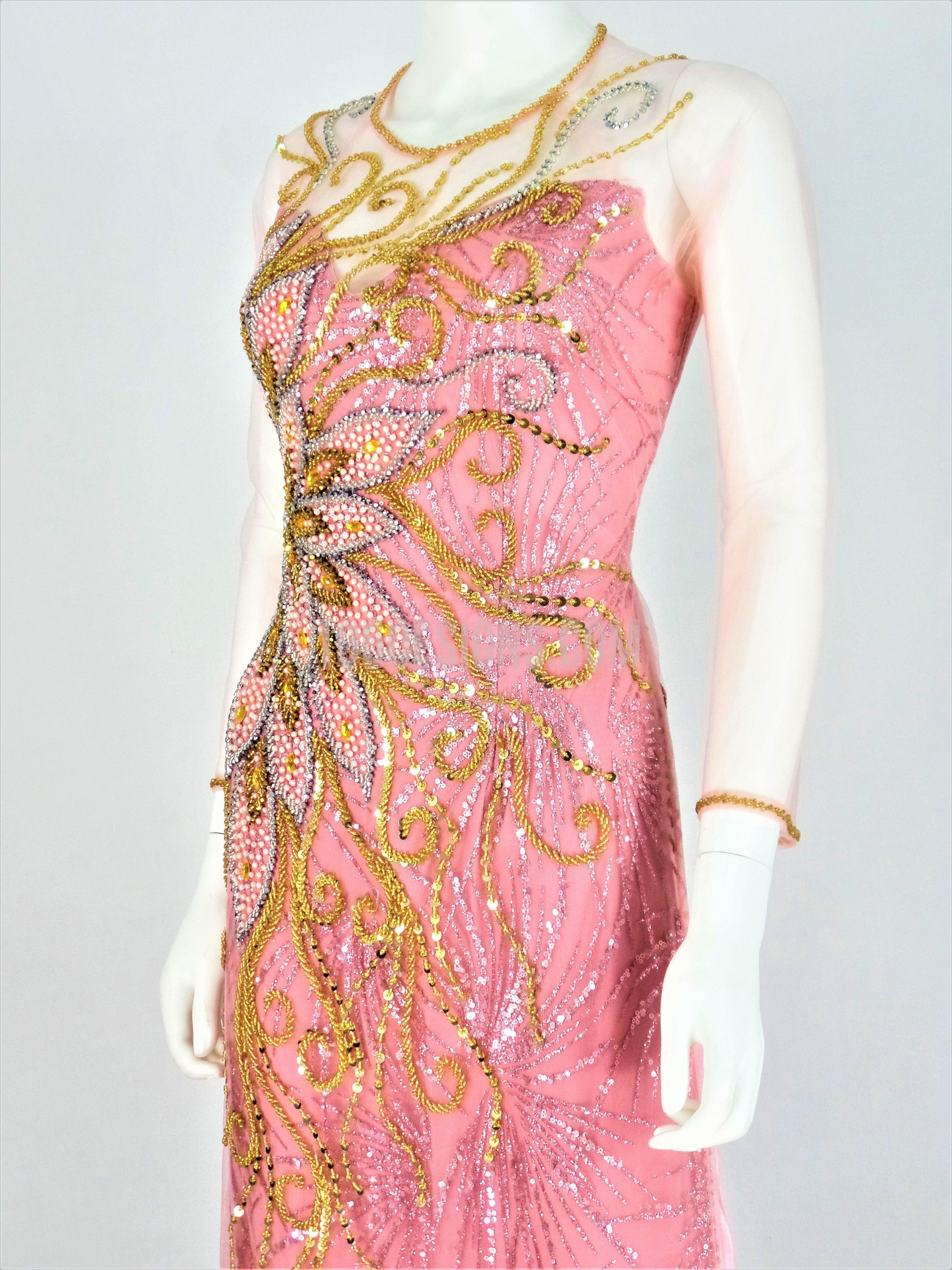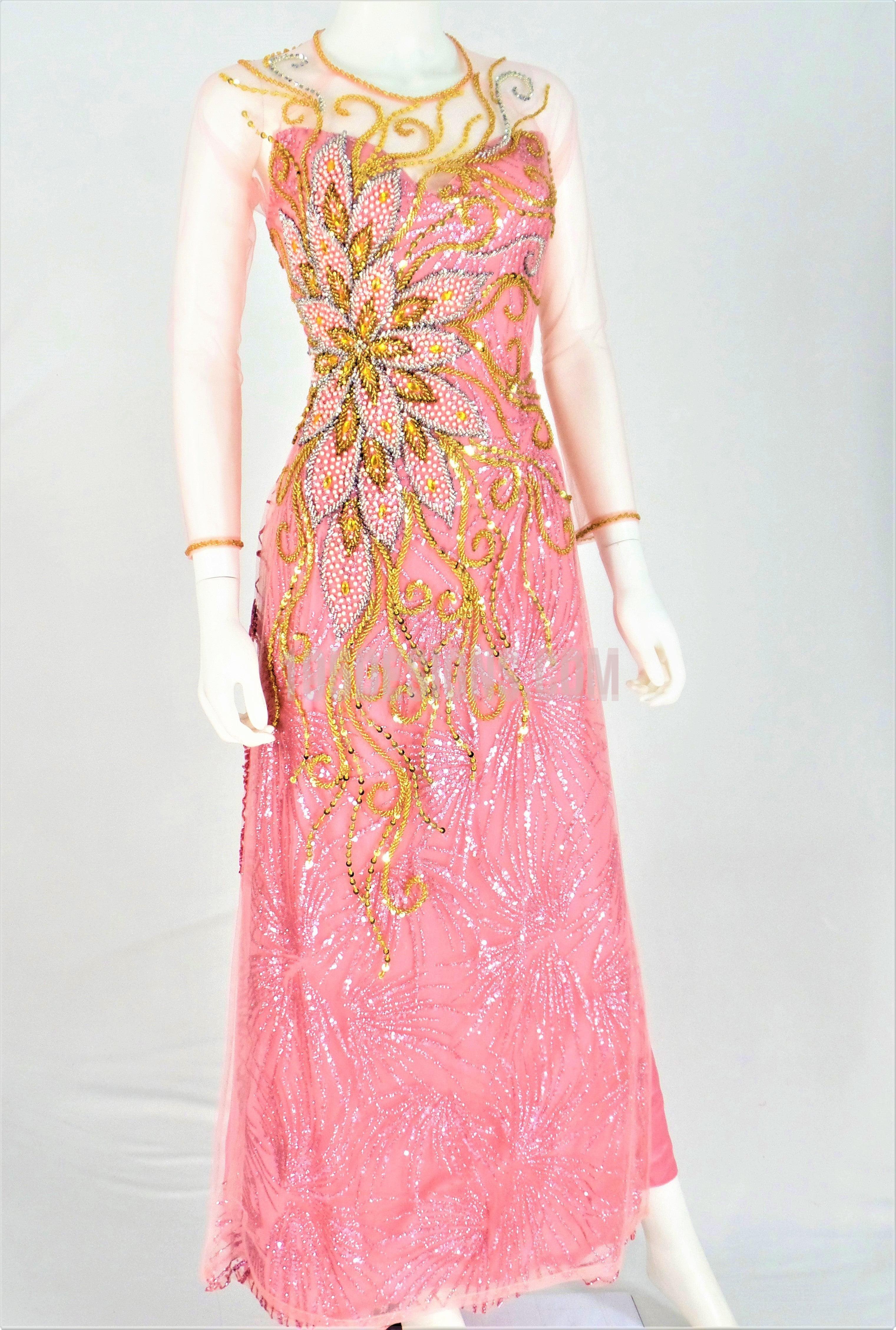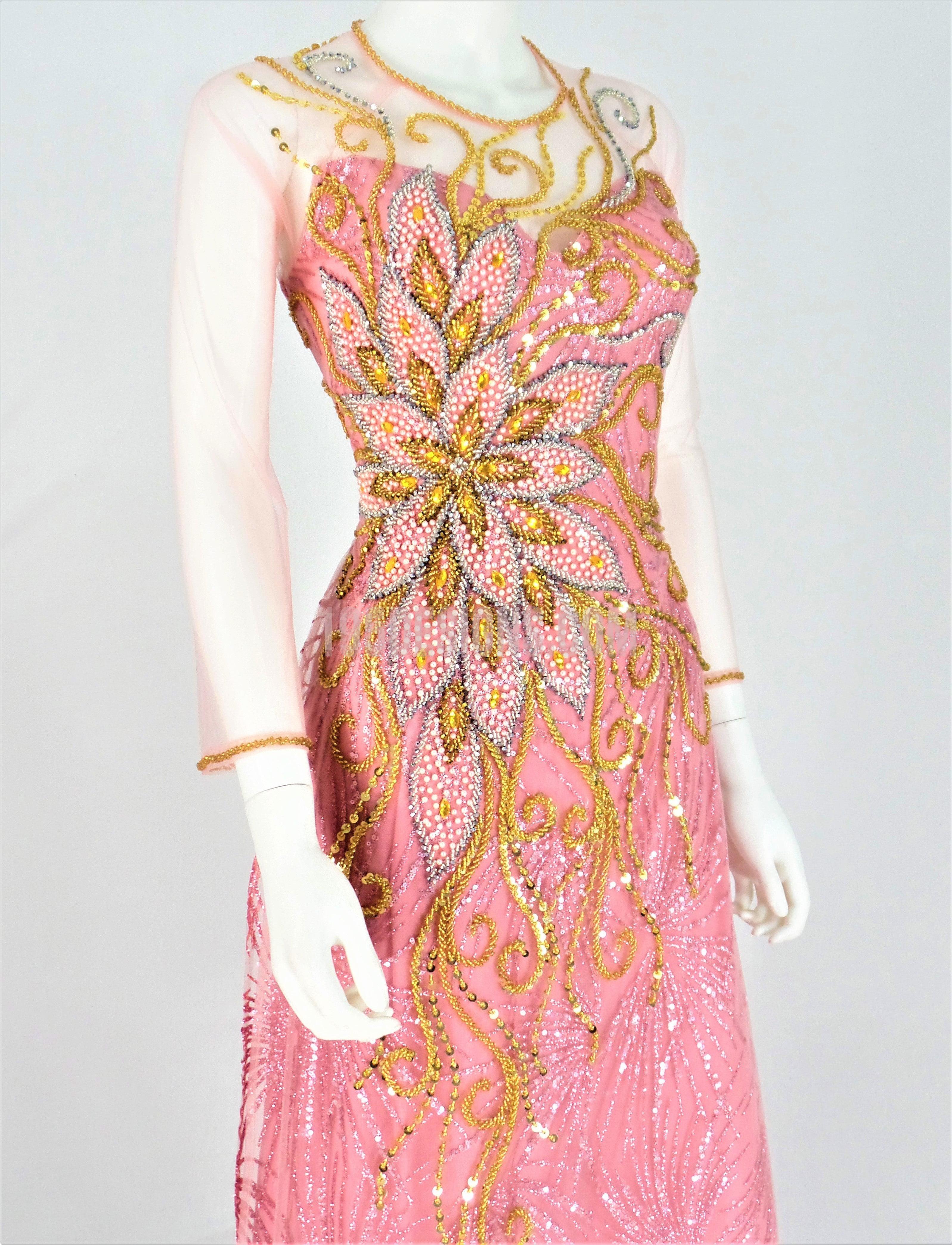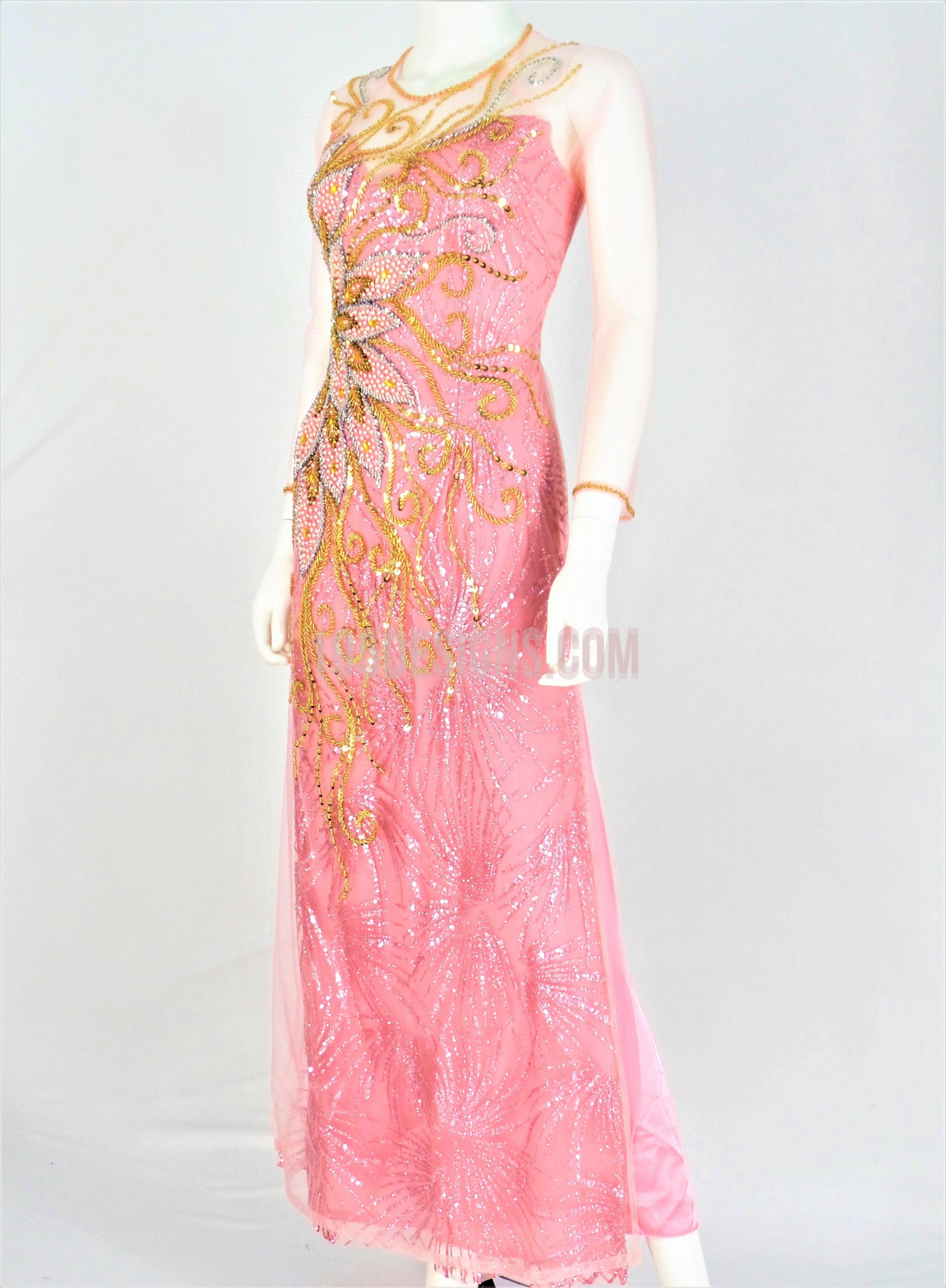 Pink Crystal Vietnamese Long Dress / Áo Dài Hồng Đính Đá Cườm