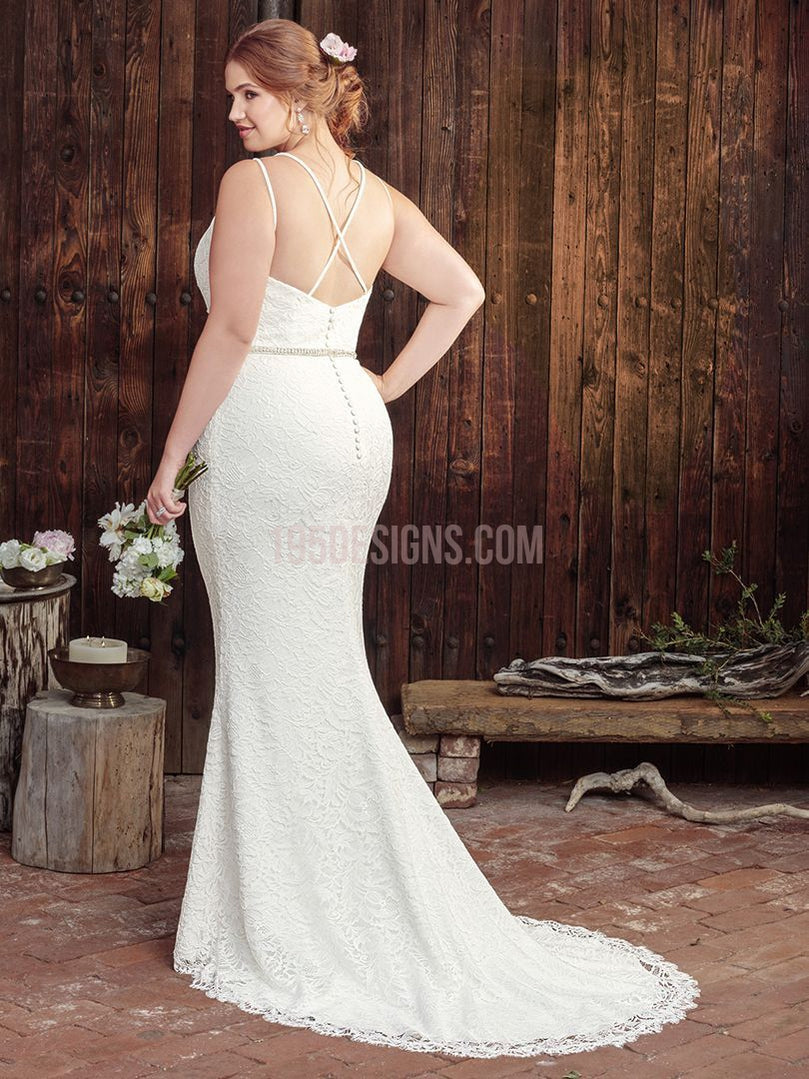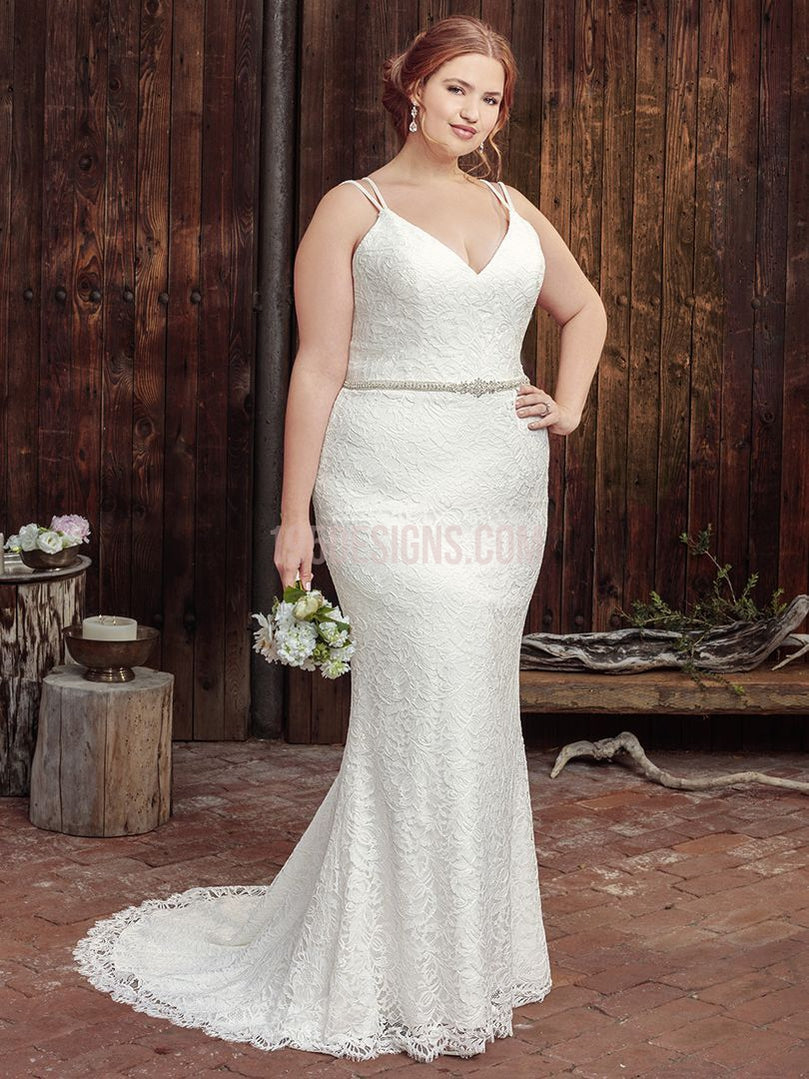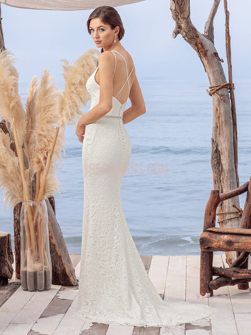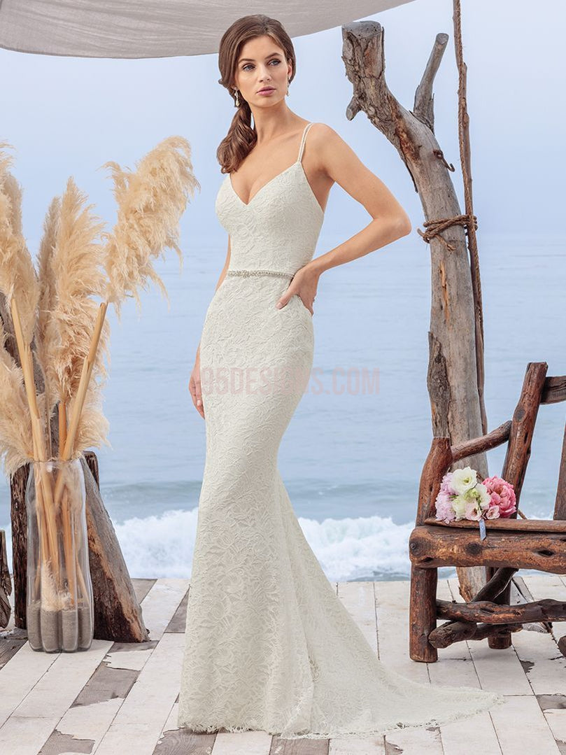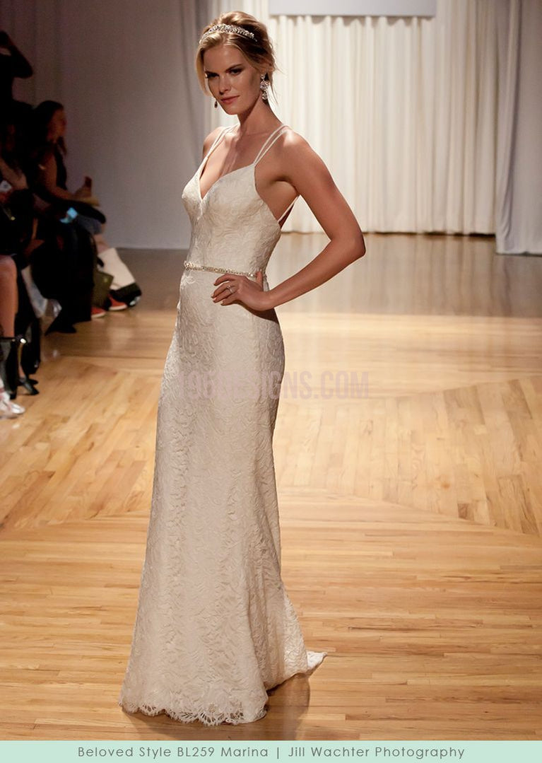 Marina takes the shape of a subtle fit and flare gown. The beautiful textured lace over stretch georgette provides a phenomenal fit, with double spaghetti straps that cross in the back, along with a jeweled belt adding additional visual elements of intrigue to this V-neckline gown.