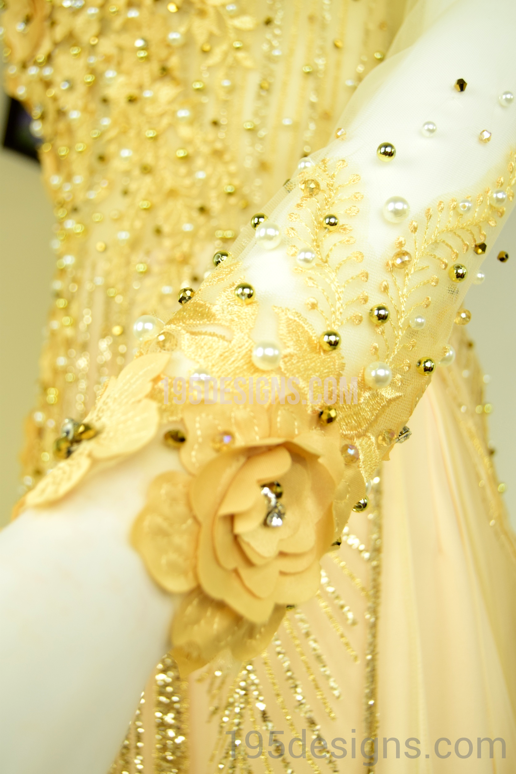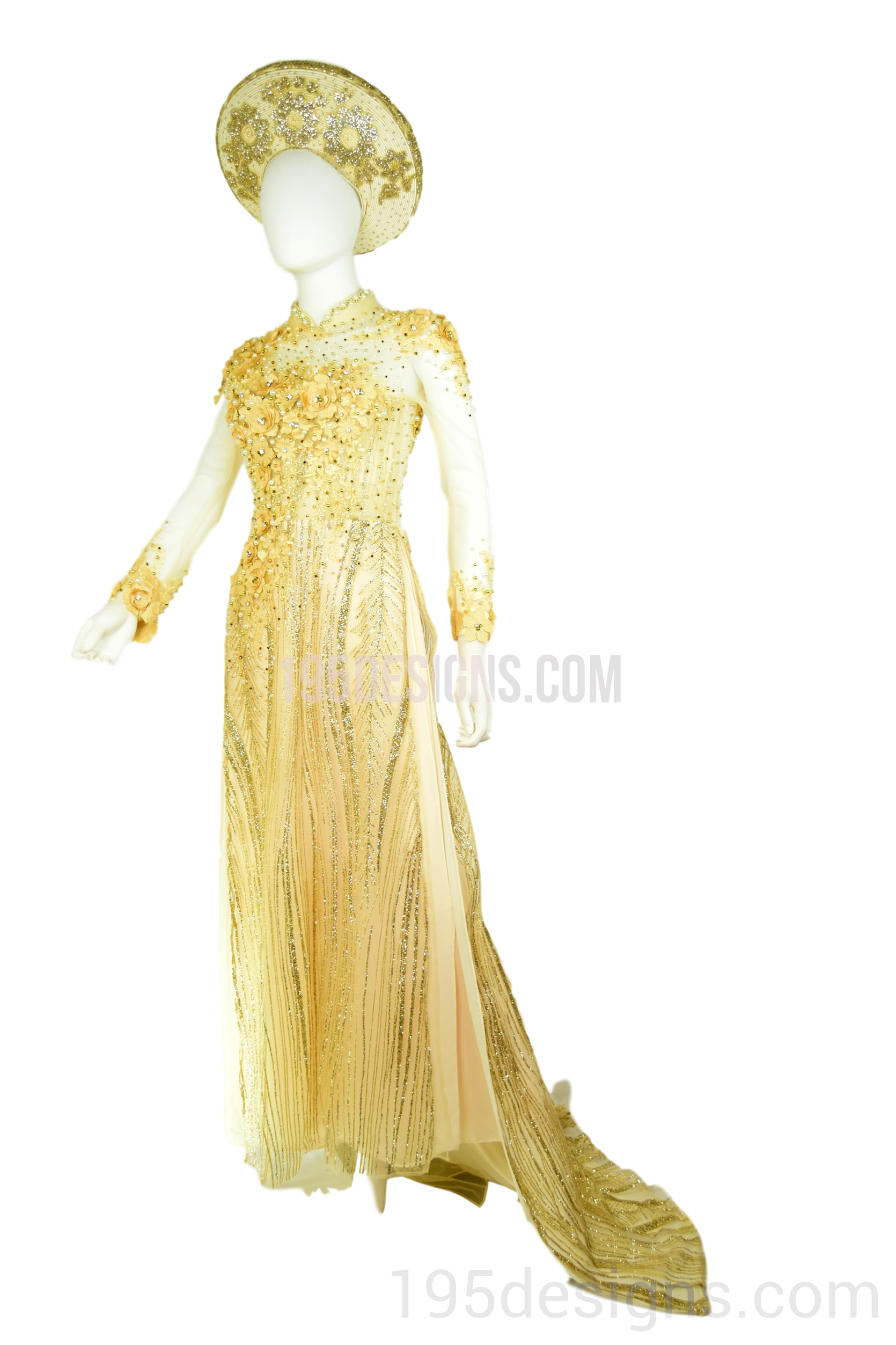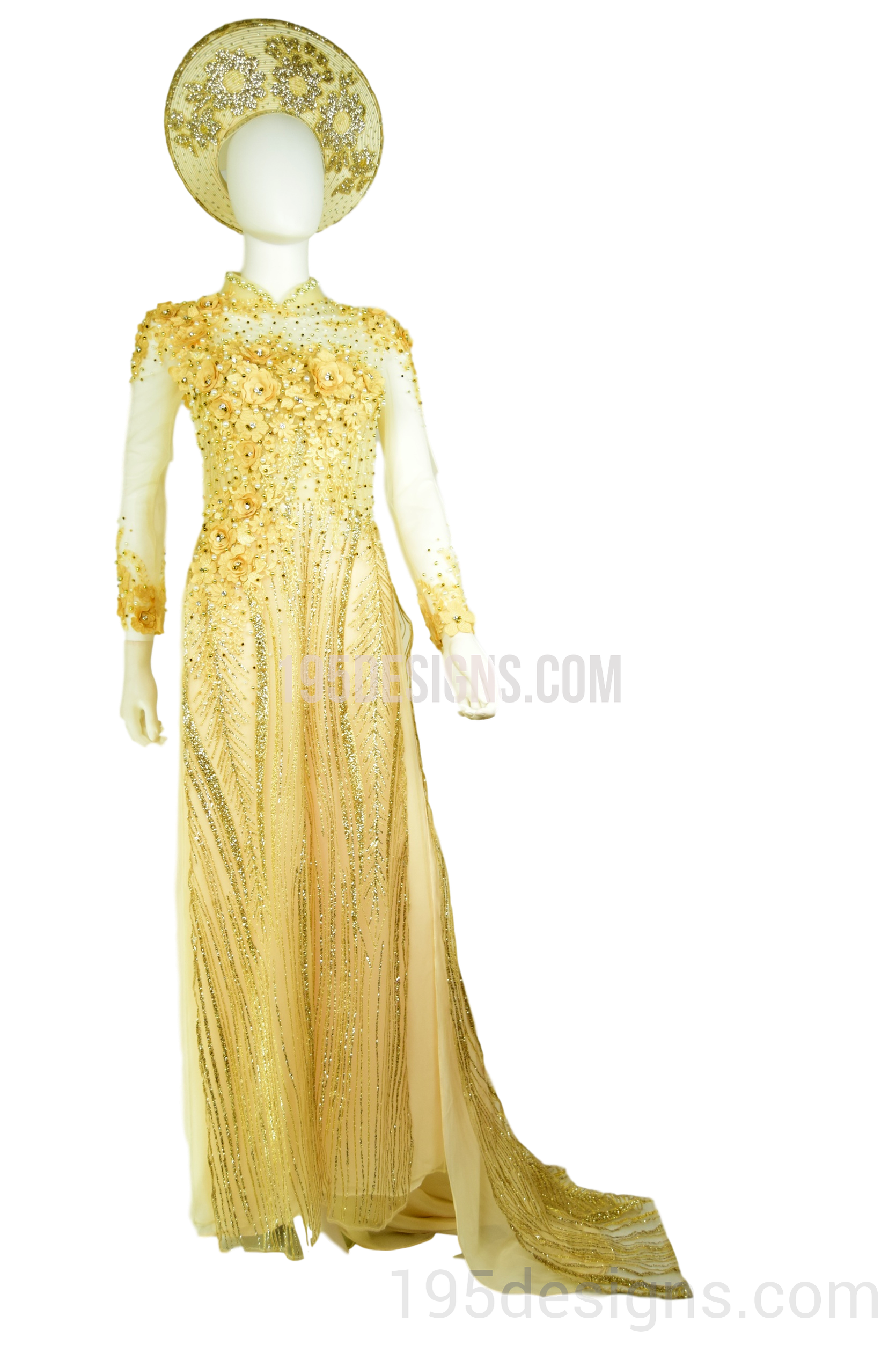 SKU: 12718-12ÁO DÀI Cưới Kem Vàng cao cấp Tay Von Kết Đá Pha Lê| Champagne color AO DAI Crystal Wedding