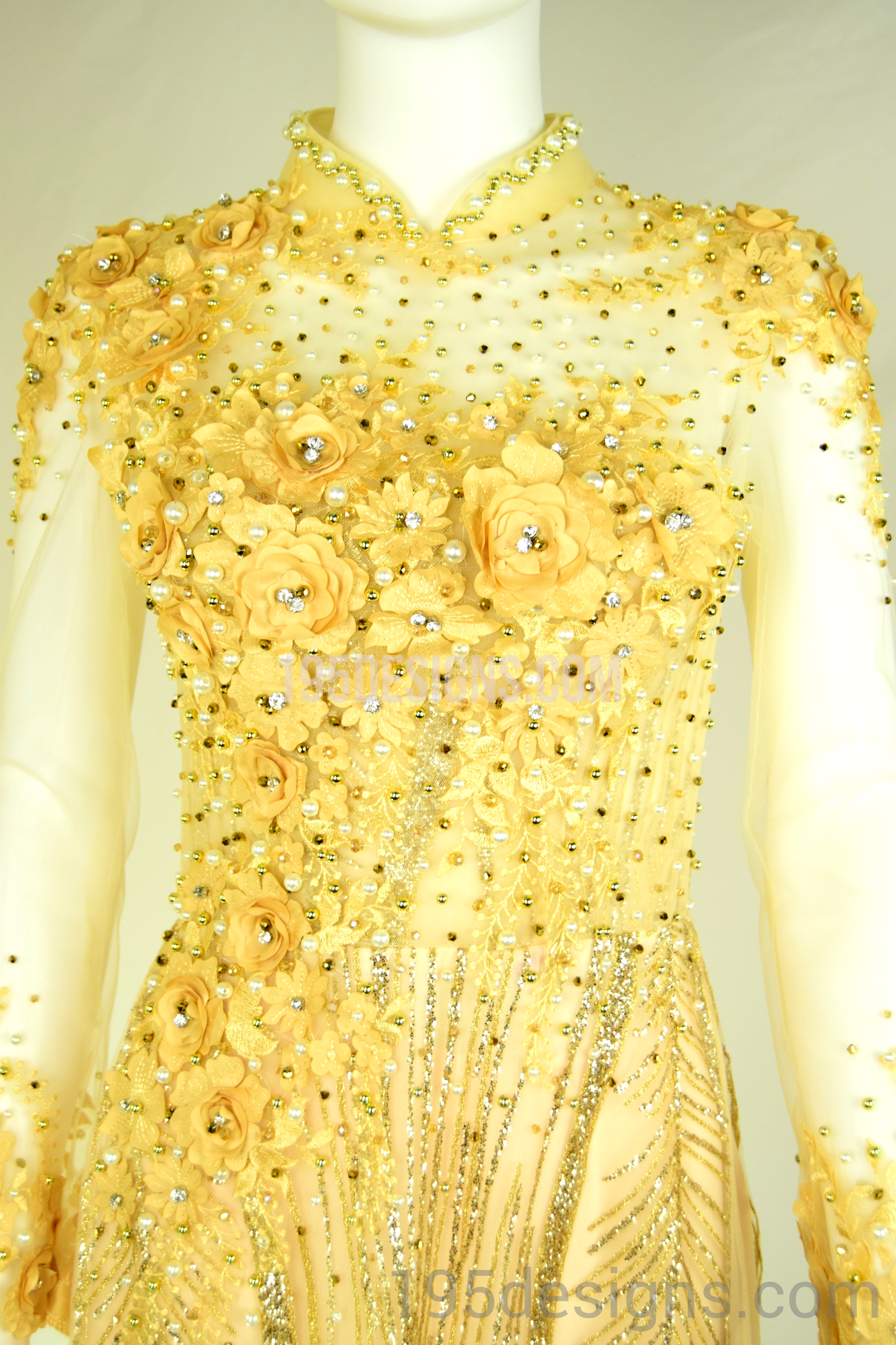 ÁO DÀI Cưới Kem Vàng cao cấp Tay Von Kết Đá Pha Lê| Champagne color AO DAI Crystal Wedding