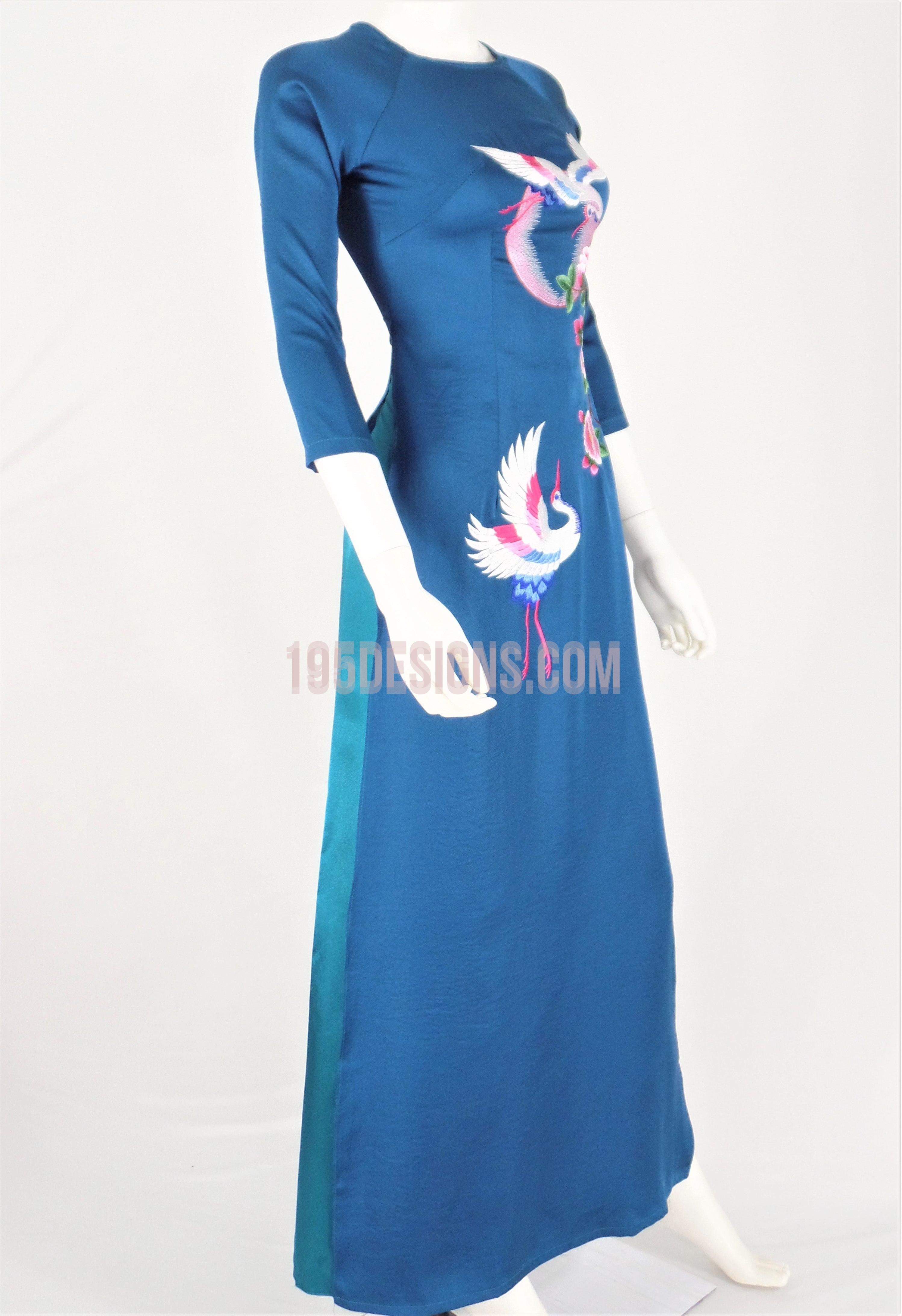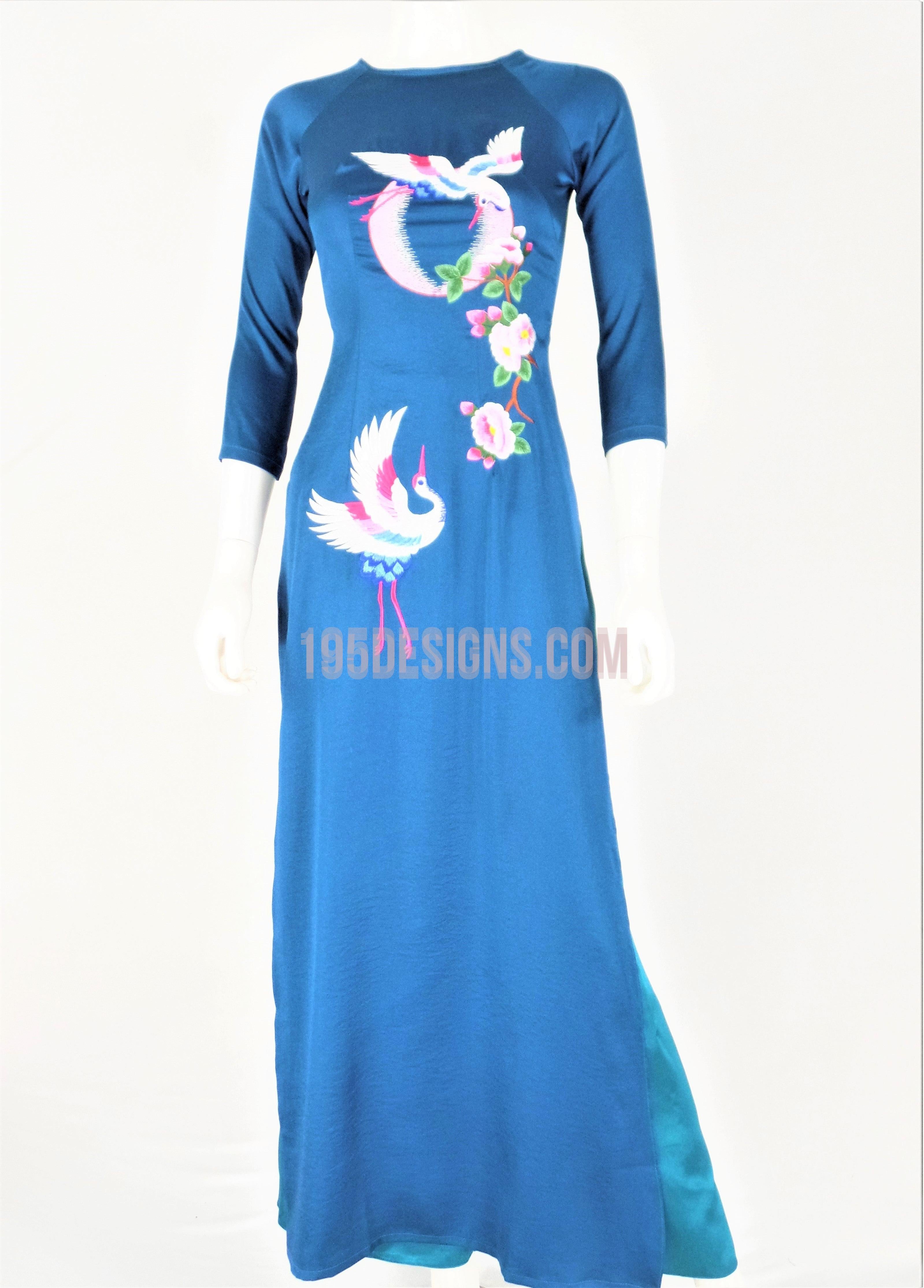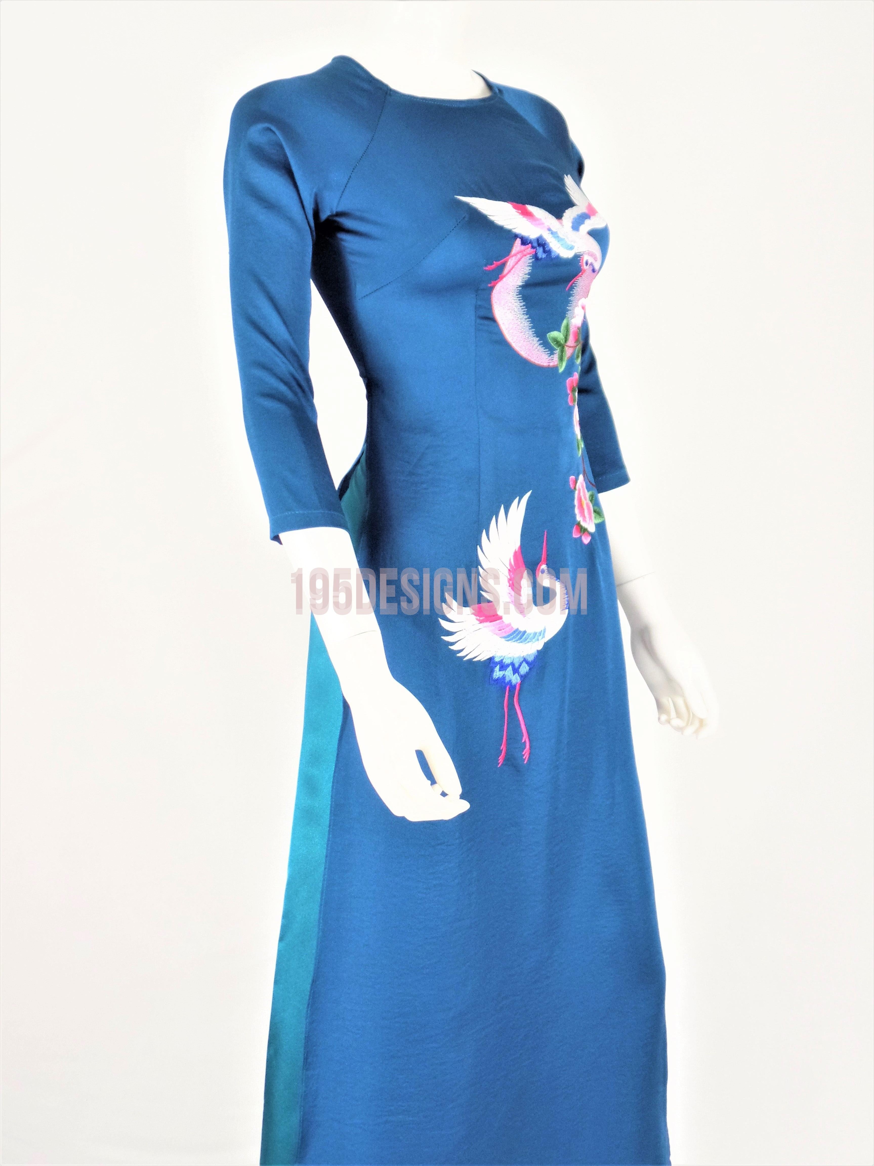 SKU: 602029Áo Dài Lụa Xanh Dương Thêu Hoa | Blue silk Ao Dai Flower Embroidery