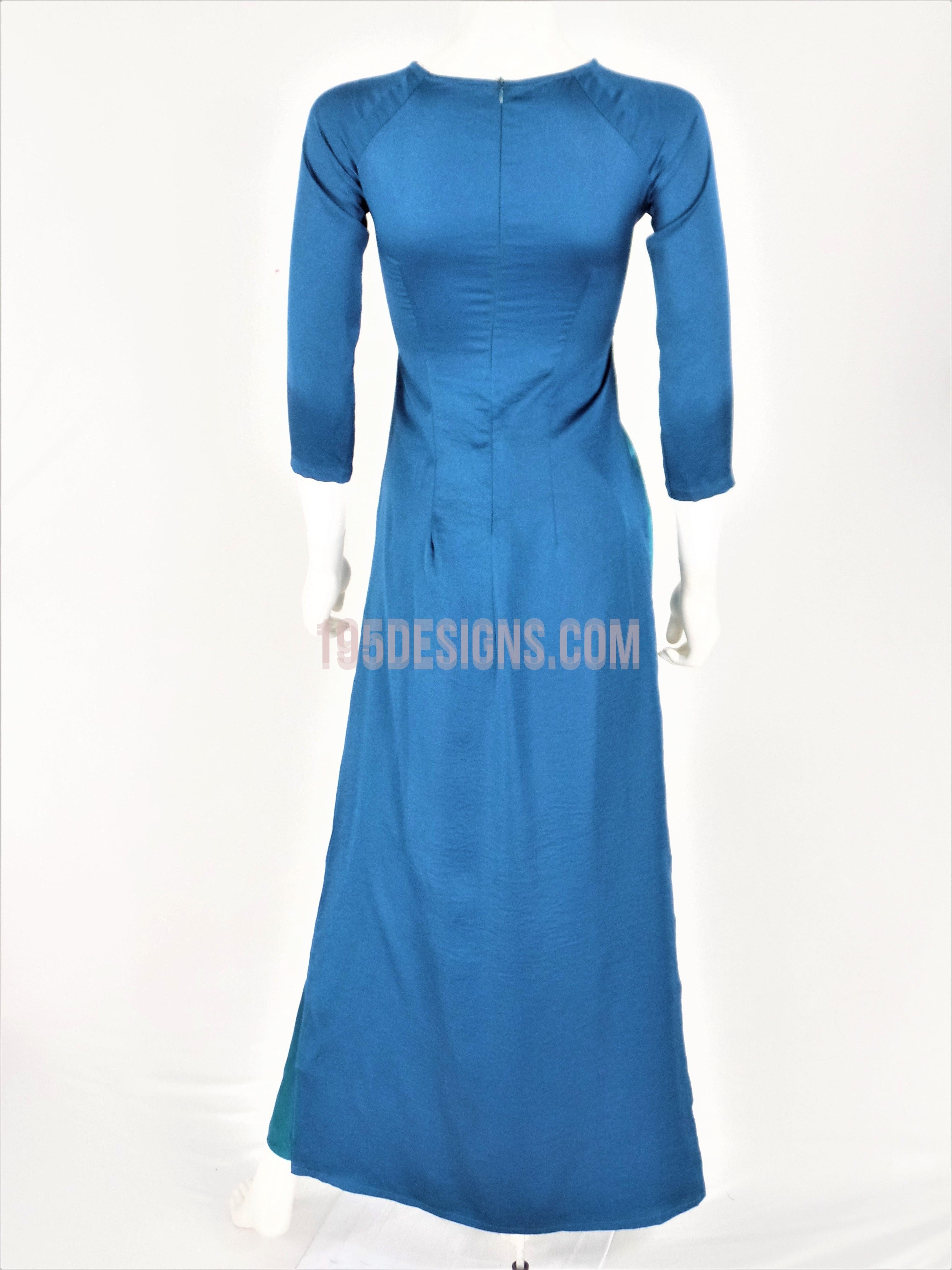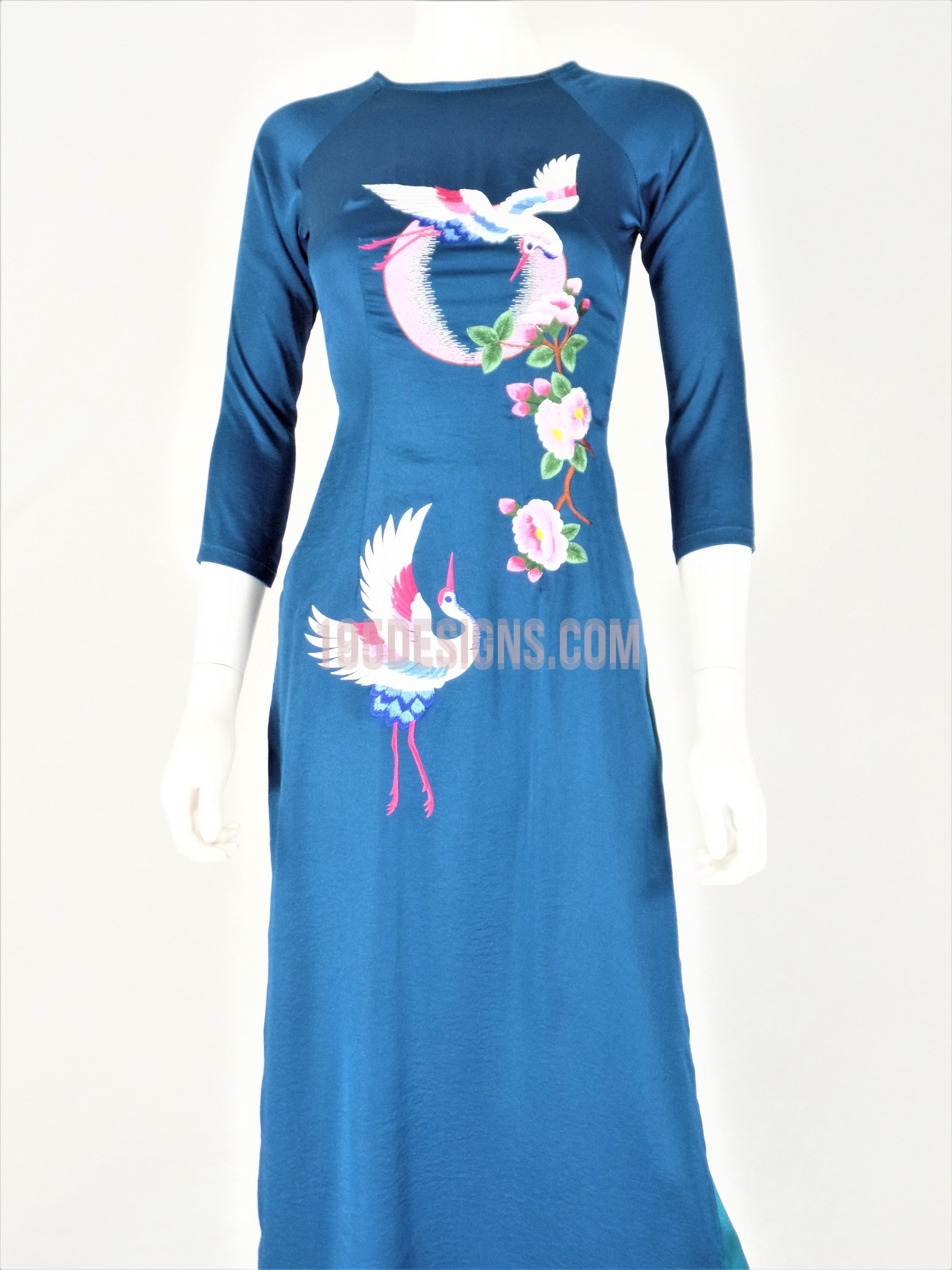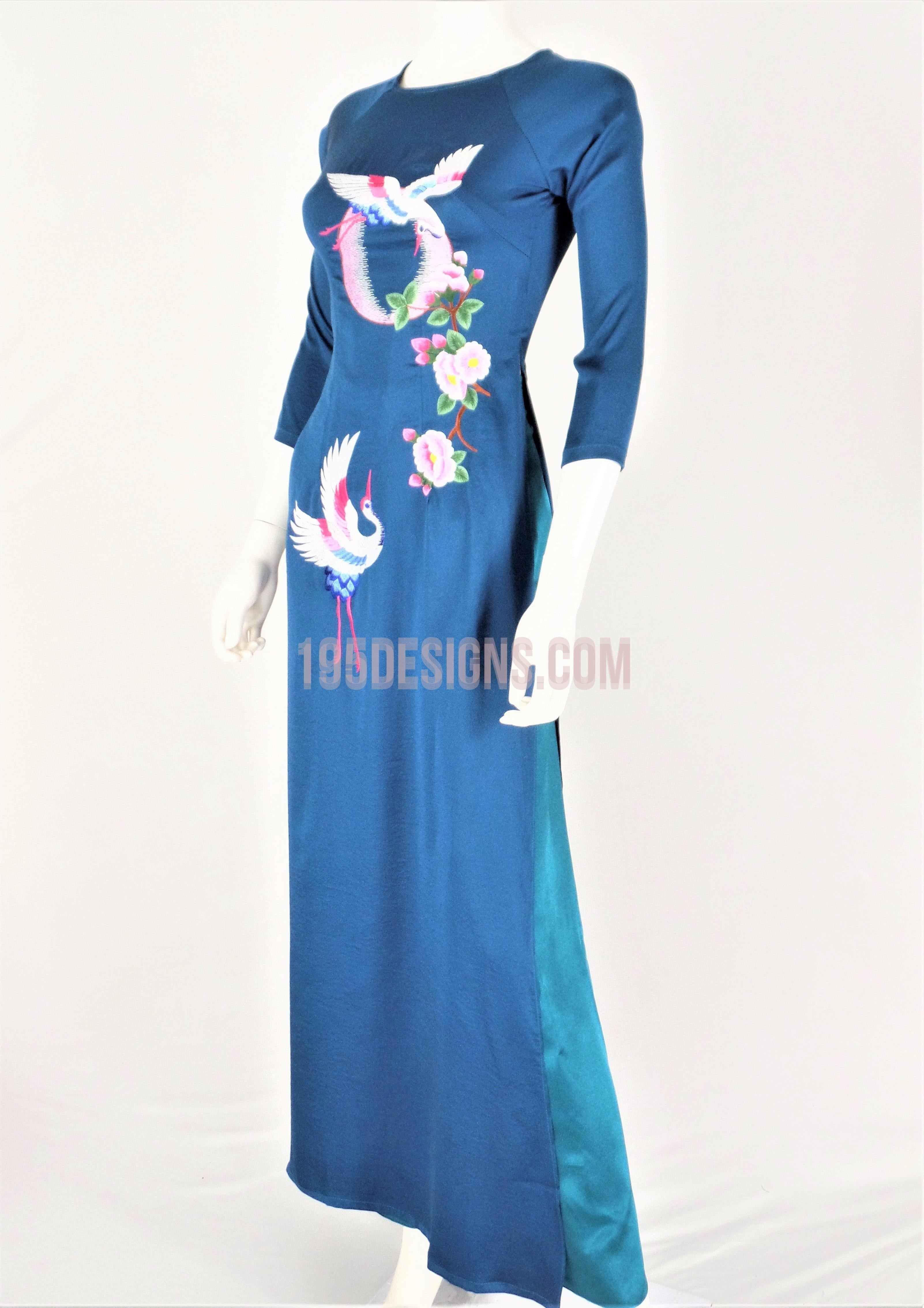 SKU: 602029Áo Dài Lụa Xanh Dương Thêu Hoa | Blue silk Ao Dai Flower Embroidery