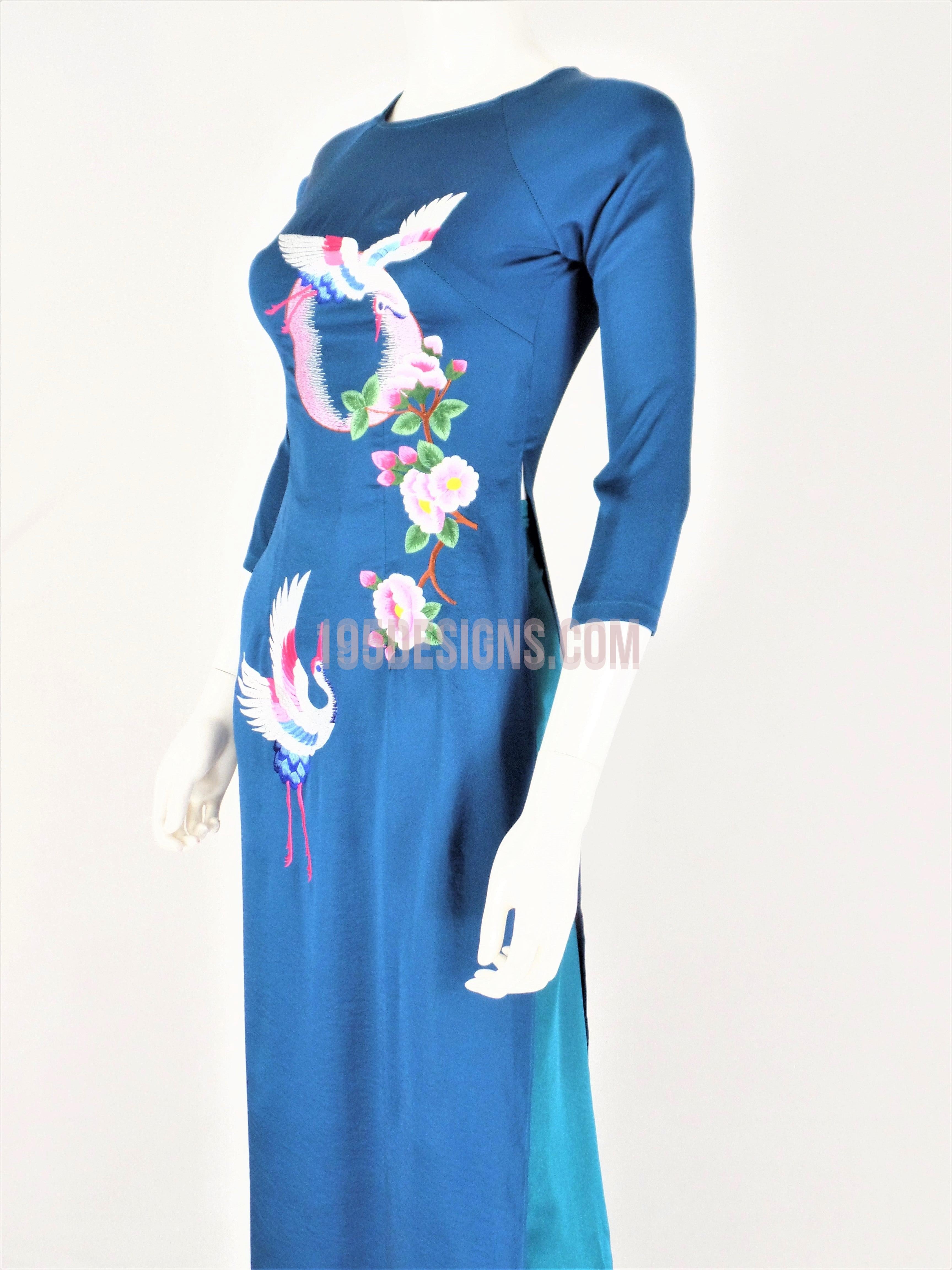 Áo Dài Lụa Xanh Dương Thêu Hoa | Blue silk Ao Dai Flower Embroidery